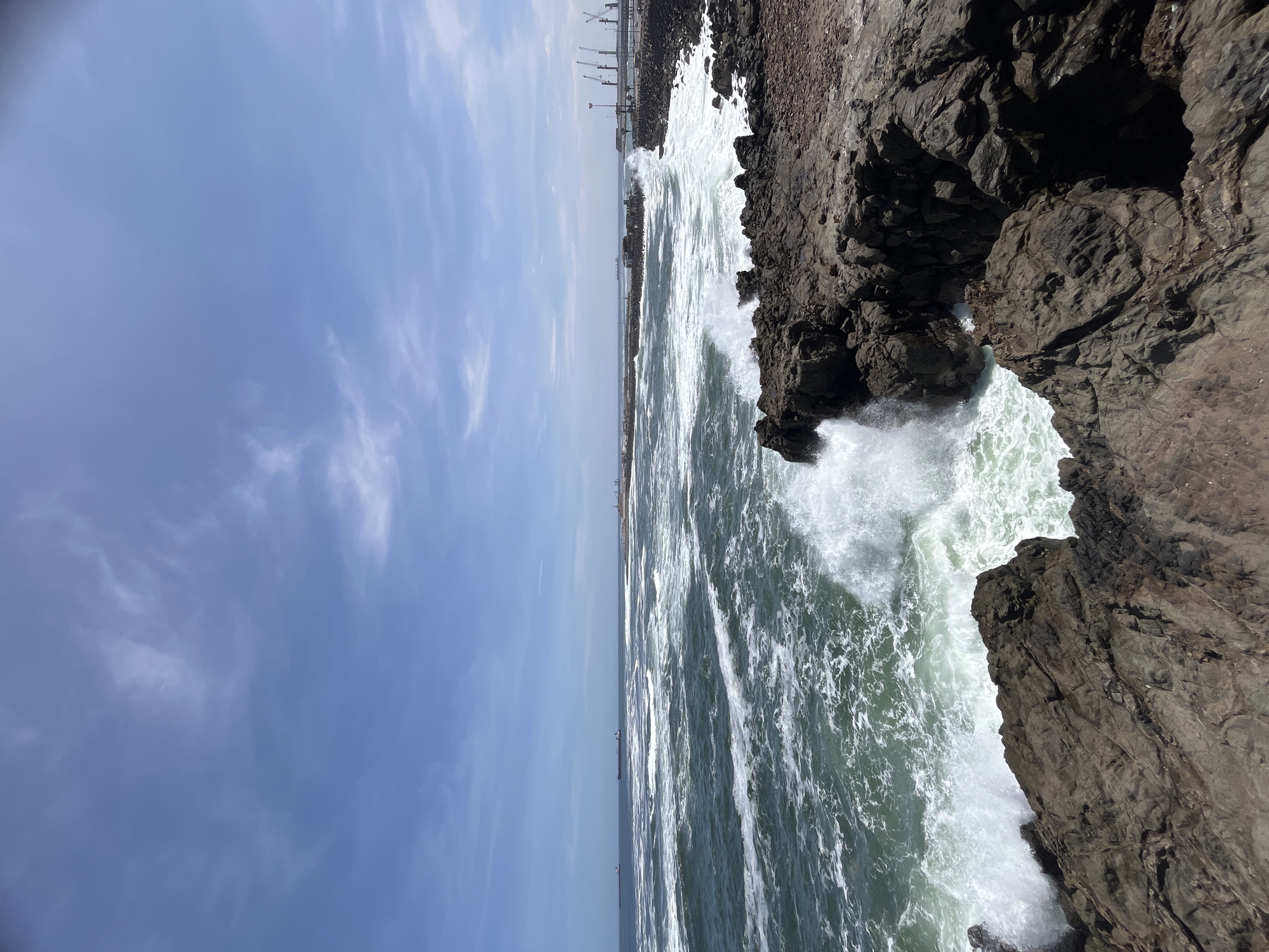 This image depicts a turbulent coastal scene in Arica, Chile, under a clear blue sky with scattered thin white clouds. The immediate foreground and midground on the right are dominated by rugged, dark-colored rock formations. Large, foamy, teal-green ocean waves crash forcefully against these rocks, generating significant white spray. The open ocean extends to the left, showing numerous white-capped waves. Two large, dark-hulled cargo ships are visible on the horizon in the left-mid distance. To the right, an industrial port facility is present, featuring a long rock breakwater extending into the water. Behind this breakwater, multiple tall gantry cranes, associated port infrastructure, and utility poles are discernible. No human subjects or discernible human activity are visible within the frame.