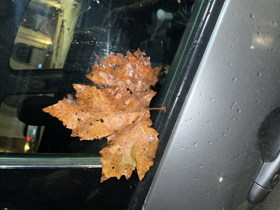 A large, dry, brown leaf clings to the window of a car