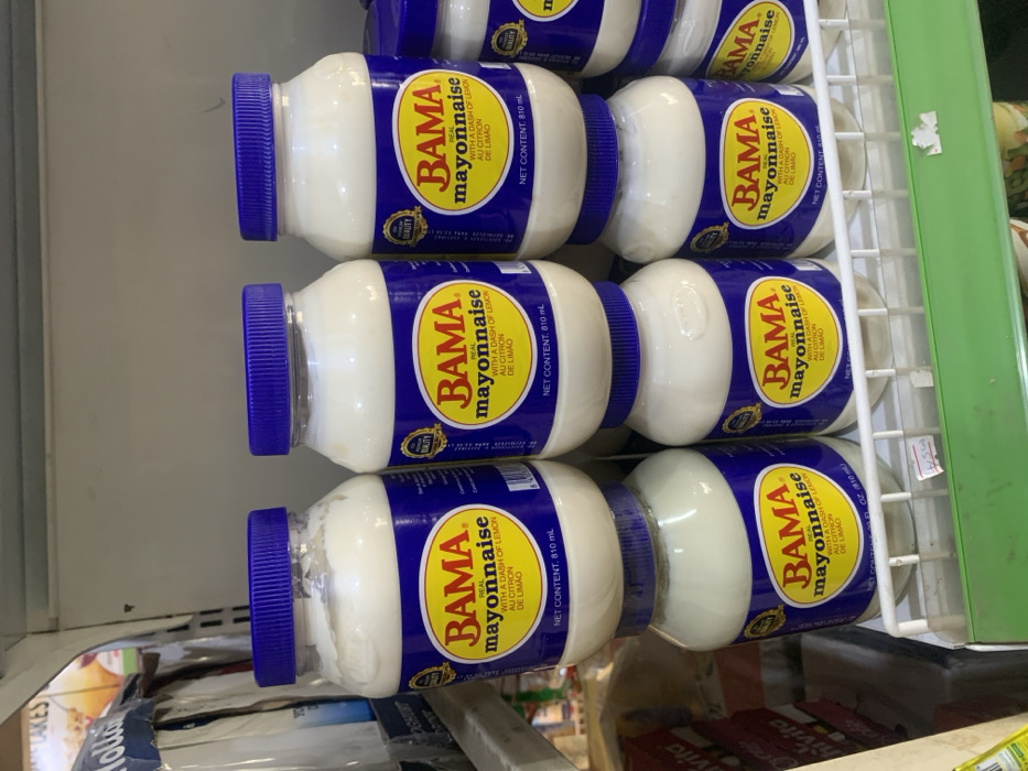 The image displays an indoor retail environment in Aviation Quarters, Nigeria, featuring multiple jars of BAMA Real Mayonnaise