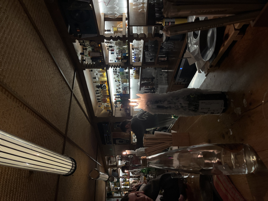 The image depicts the dimly lit interior of The Clumsies bar, located in the city of Athens, Greece. The scene is observed from a patron's perspective at a wooden bar counter. In the immediate foreground, a clear glass bottle, likely containing water, stands on the left. To its right, a dark bottle, heavily encrusted with white, solidified wax, serves as a candelabra for three actively burning candles, their flames visible and molten wax dripping. A wooden holder filled with numerous chopsticks is positioned between the bottles. Further right, a dark, empty plate rests on a wooden tray, accompanied by another container of chopsticks. In the midground, behind the bar, a male staff member in a dark long-sleeved shirt with a light-colored emblem on the back is observed reaching towards shelves. To the far left, a person with dark hair and a dark top is partially visible, seated at the bar. Another smaller, wax-covered candle with a lit flame is present further down the bar to the left. The background features extensive shelving spanning the width of the image, densely stocked with various liquor and spirit bottles, illuminated by strip lighting. Glassware, including wine glasses and tumblers, is arranged on the shelves. Dark audio speakers are mounted above the shelving on the right. The ceiling is covered with woven straw panels, from which two long, cylindrical, slatted light fixtures hang.