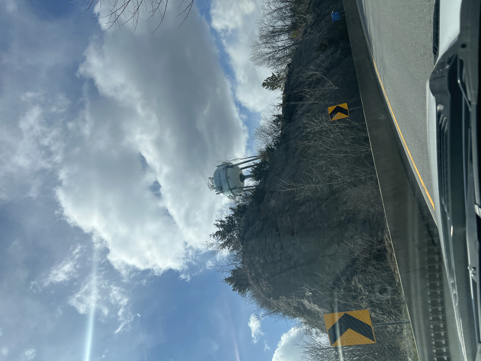 The image depicts a view from inside a vehicle, looking out at a rocky cliff face adjacent to a highway. The road, marked with a yellow line, is to the right of the frame. A vehicle part is also visible on the right side. On the cliff's edge, there's a water tower bearing the words "HUDSON VALLEY MALL". Directional signs are placed alongside the road, indicating a curve or turn. Above the cliff, the sky is filled with clouds and clear blue patches. The location is likely near the Hudson Valley Mall, in or around the City of Newburgh, United States of America.