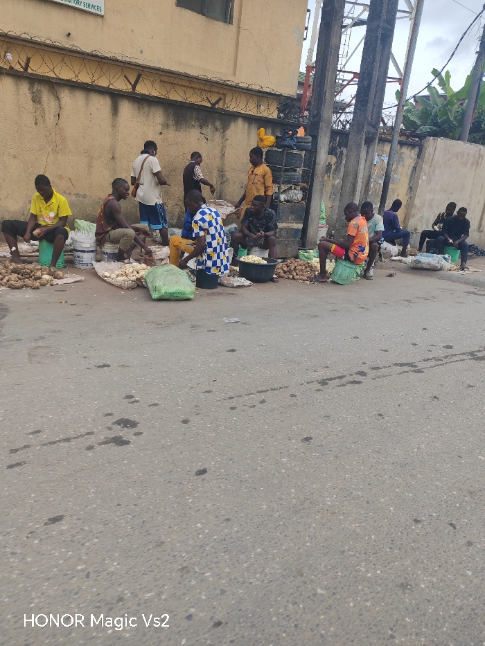This image captures a roadside market scene in Str, Nigeria. Approximately 12 to 14 adult males are positioned along the edge of a gray asphalt road, primarily engaged in peeling and preparing white root vegetables, consistent with yams or cassava. Individuals are seated on various low supports, including plastic buckets and green woven sacks. Piles of raw and peeled tubers are distributed on the ground and on these sacks, some of which are branded "DIAMOND." A light-brown concrete wall, topped with multiple strands of barbed wire, runs parallel to the road. Behind the wall, a building displays a partially visible sign indicating "LABORATORY SERVICES." To the right, a large metal utility structure and tropical foliage are discernible. The asphalt road surface exhibits wear and dark staining. The sky is uniformly overcast.