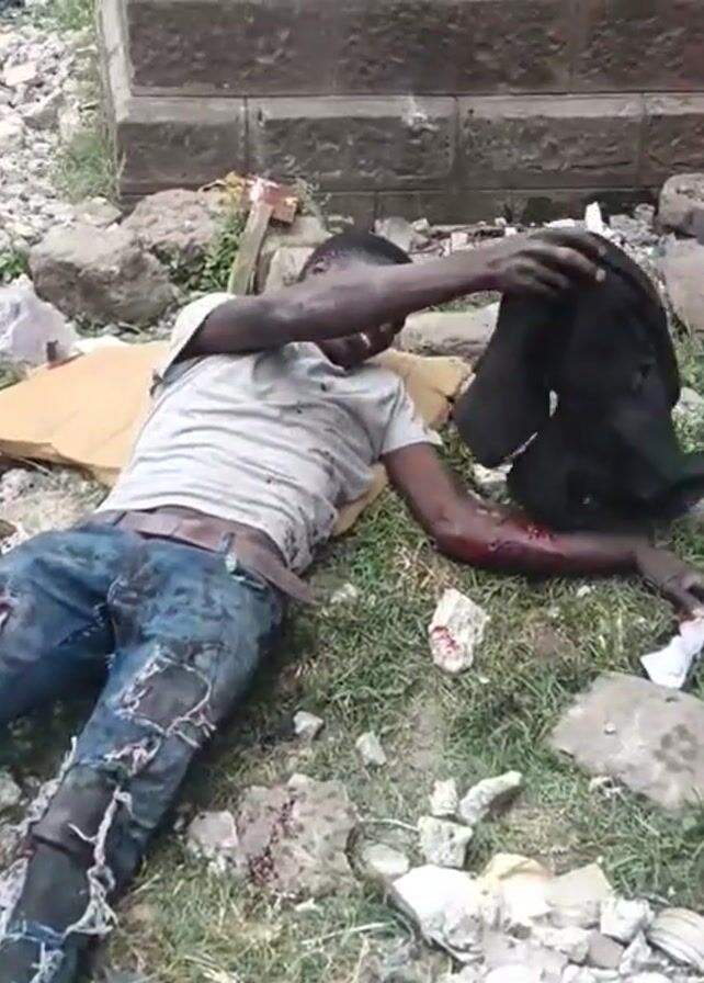 A video shows a man lying on the ground near a concrete structure and rubble, apparently injured. The man is wearing a light-colored t-shirt and ripped blue jeans. His arm and leg appear to have cuts and blood on them. He holds a dark cloth over his arm. Someone stands nearby, partially visible, as the injured man grimaces in pain. The ground is covered in grass, dirt, and debris.