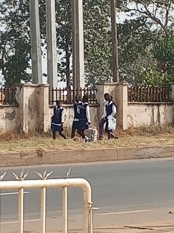 The image depicts an outdoor scene in Karu, Nigeria, featuring five individuals on a raised, dry dirt embankment. The individuals, appearing to be students, are dressed in school uniforms consisting of white shirts or blouses and dark blue or black skirts/trousers; the person on the far right also wears a white lab coat or similar overgarment. They are positioned near a low, light-colored concrete wall topped with a dark metal fence. Behind this wall, four tall, light-grey concrete pillars are visible, one featuring faint vertical inscriptions. Dense green trees and foliage form the background. In the midground, a paved road with a visible white line stretches horizontally. The immediate foreground shows a partial view of a cream-colored metal barrier with pointed finials. A small white object rests on the ground near the center of the group of students.