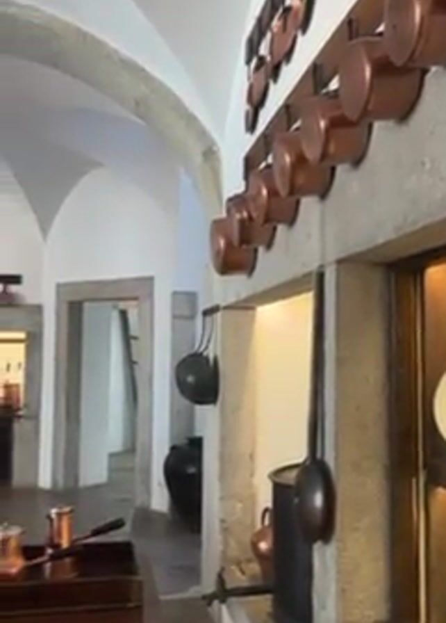 large, historical kitchen. The kitchen features vaulted ceilings with stone arches. Numerous copper pots and pans hang on wooden racks mounted high on the walls. Underneath, there are individual cooking alcoves, each equipped with old-fashioned stoves and ovens. A few large black pots sit next to the alcoves. In the foreground, two wooden tables display various copper teapots, cups, and other kitchenware. The room appears to be part of a museum or historic building, as it is well-maintained and exhibits a collection of antique culinary tools. There is no activity in the room. The camera slowly pans to showcase the kitchen's size and contents.