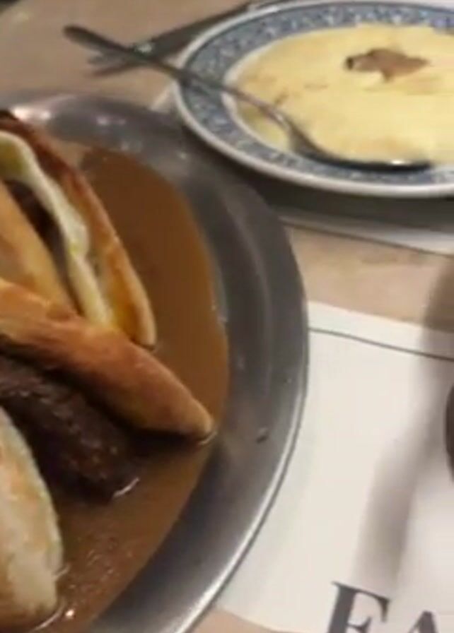 table setting with three dishes. The first dish, on the left, is a metal plate with a francesinha sandwich covered in sauce. In the middle, there is a small plate with a creamy yellow pudding, topped with a dark garnish. On the right, a metal pot holds shrimp in a tomato-based sauce, garnished with chopped greens. Silver cutlery rests on the plates, and a placemat labeled "FA" is visible under the dishes.