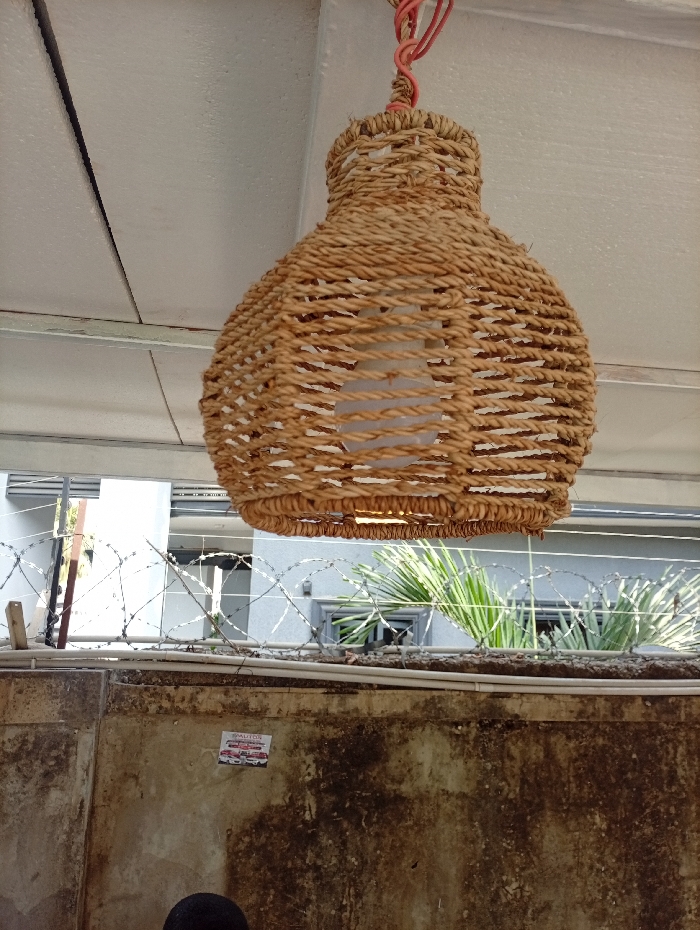 An outdoor scene in Gwarinpa, Nigeria, is captured from a low-angle perspective. The primary subject is a bell-shaped pendant lamp, hand-woven from natural light-brown fiber, suspended by a red electrical cord from a white, paneled ceiling structure. A white light bulb is visible within the lamp's open weave. Below the lamp, a weathered concrete wall with dark staining runs horizontally across the mid-ground. Above this wall, a security barrier constructed of razor wire is present. A white pipe is affixed horizontally to the top of the concrete wall, beneath the razor wire. A small, rectangular paper advertisement, displaying text and vehicle images (faintly indicating "QUALITY AUTOS"), is affixed to the wall's left side. Beyond the wall and razor wire, a modern, light-colored building with dark-framed windows and green, palm-like vegetation is visible in the background under daylight conditions. The top of a dark, undefined object or possibly a person's head is partially visible at the bottom edge of the frame.