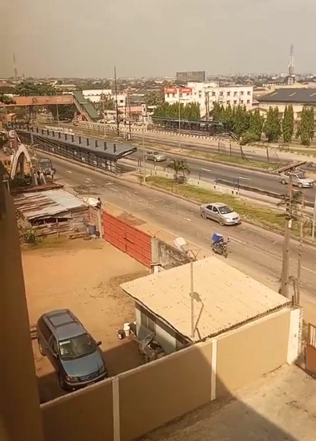 street scene in what appears to be an urban area. A multi-lane road runs horizontally across the frame, with various vehicles moving along it, including cars, a truck, and a motorcycle. On the left side of the frame, there is a parking area with a blue minivan. There are also some buildings and structures visible, including a small hut-like building with a corrugated metal roof, and a red fence. The background includes buildings of various sizes, trees, and what appears to be a telecom tower in the distance. The lighting suggests it is daytime, and there are shadows cast by the buildings. A man in a white shirt and dark pants exits a gated area on the right. The video is taken from an elevated perspective, likely from a building overlooking the street.