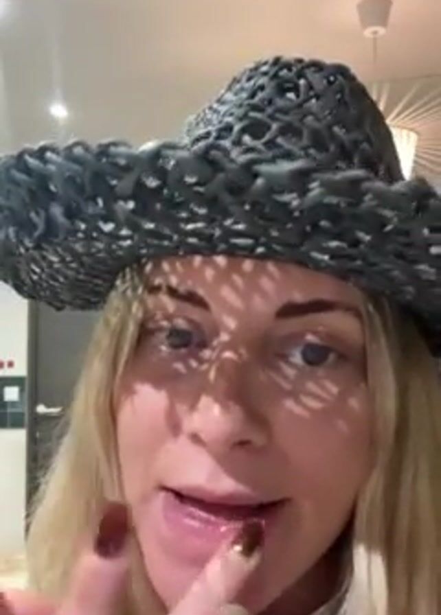 A woman with long blonde hair is applying lip gloss with her finger in a close-up shot. She is wearing a black woven cowboy hat, which casts shadows on her face. Her fingernails are painted in multiple different colors. The background features a white ceiling with a decorative light fixture and a white wall with a dark door.