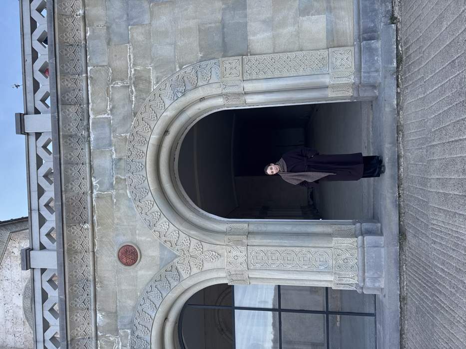 A female subject stands centered within a decorative arched stone doorway in Sighnaghi, Georgia