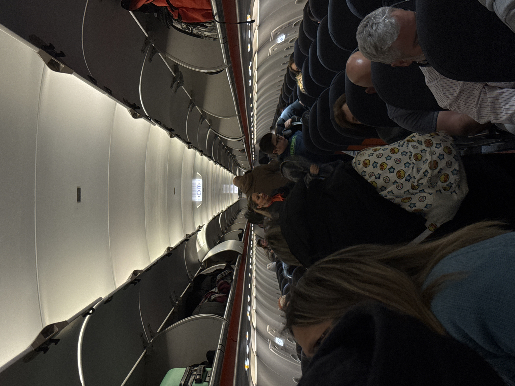 The scene depicts the interior of a commercial passenger aircraft cabin, observed from a standing position in the aisle. The aircraft is likely at an airport located in Niederanven, Luxembourg. The cabin is dimly lit by overhead panel lights and individual reading lights. Numerous passengers are present, some standing and moving in the central aisle, and others seated in rows of dark blue fabric seats on both sides of the aisle. Overhead bins line both sides of the cabin, some are open revealing various pieces of luggage, including a green suitcase and an orange backpack, while others are closed. A red strip runs along the base of the overhead bins. Multiple "EXIT" signs with left-pointing arrows are visible further down the cabin on the ceiling panel. In the mid-ground, a young male wearing glasses and a blue sweatshirt with "MINECRAFT" text is visible standing in the aisle. Behind him, a person with an orange scarf, possibly a flight attendant, is also standing. In the foreground, the back of a person with long brown hair wearing a light blue top is visible. Further back, seated passengers are visible, including a man with grey hair and a striped shirt in the right foreground, and a bald man behind him. A white backpack with multiple cartoon faces and stars is visible near the grey-haired man. The overall activity suggests boarding or deboarding procedures are underway.