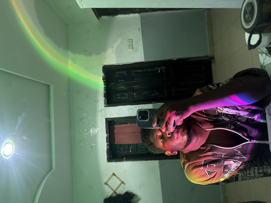 The image displays an indoor mirror selfie of an adult male in a room located in Ipetumodu, Nigeria
