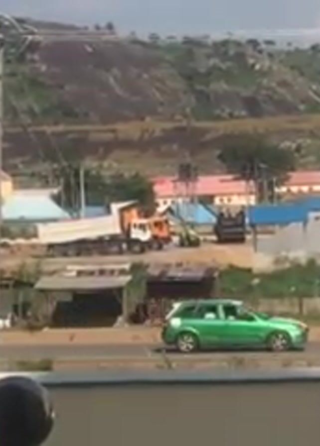 From behind a low wall with two white pillars, we see a road with moderate traffic, including cars, a bus, and trucks. One orange and white dump truck is raised, appearing to be unloading something. Beyond the road is a compound with several buildings, some with blue roofs and one with a red roof. Piles of aggregate material are visible in the compound. Behind the compound, a large, rocky hill rises into the distance. Power lines and utility poles are visible throughout the scene. The sky is overcast.