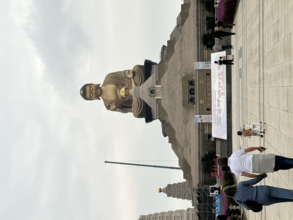 A colossal golden Buddha statue dominates the image, set against a cloudy sky