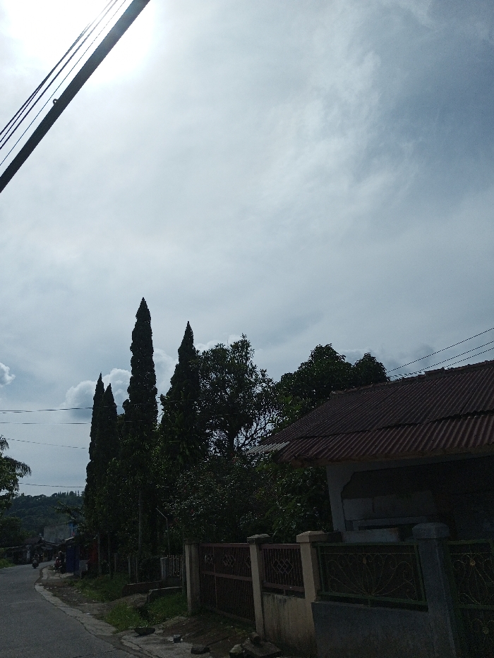 The image depicts a daytime scene in Kandenuwara, Sri Lanka, looking down a curving paved road under an overcast sky. A dark power line extends diagonally from the top-left corner. On the right, a low concrete wall with an ornate dark metal fence borders a property containing several tall, slender evergreen trees and dense broadleaf foliage. A building with a rusted, corrugated metal roof is partially visible behind the trees on the far right. The road recedes into the distance, where small structures line its left side, and distant hills are visible on the horizon. A single individual on a motorcycle or scooter is present on the far left side of the road, moving away from the viewer. The overall lighting is bright but diffuse due to cloud cover.