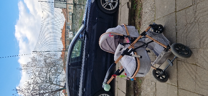 - "The image displays an outdoor scene in Kyustendil, Bulgaria, featuring a light grey baby stroller in the foreground, positioned on a grey paved sidewalk" by FM-0MIHf2, licensed under CC BY 4.0