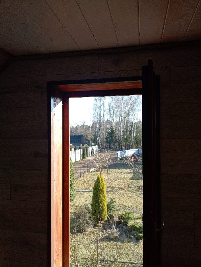 The scene depicts an exterior landscape viewed from inside a dimly lit room in Гожскі сельскі Савет, Belarus. The interior visible includes wood-paneled walls and a ceiling, with a decorative rope trim along the junction. The view is framed by an open, dark wooden door or window frame, with sunlight highlighting its left edge. The outdoor environment is sunny, suggesting late winter or early spring, characterized by mostly dry, light brown grass. A prominent, conical bright green evergreen bush stands in the center-midground, surrounded by several bare deciduous trees. A light-colored fence runs horizontally across the midground, bordering a dirt path or road. Beyond the fence, a house roof is visible on the left, and a small red structure, possibly a shed, is on the right. The background features a dense line of trees, primarily slender birch trees with white bark and bare branches, interspersed with darker evergreens, under a clear, bright sky. No people, specific actions, or interactions are visible.
