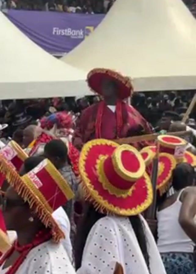 colorful procession in what appears to be a public event. Several people are wearing elaborate red and gold hats, and some are dressed in white lace garments. A man in a red and burgundy robe and hat stands out, holding what looks like a staff or baton. There is a large crowd of people in the background, and several white tents are visible. A banner with "FirstBank" is also visible in the background, suggesting a sponsored event. The overall atmosphere seems festive and cultural. People are moving and interacting within the procession.