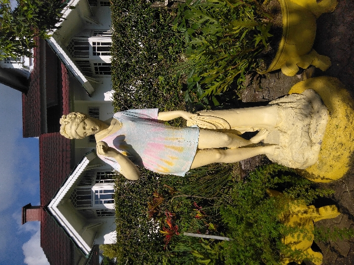 A cream-colored classical-style female statue stands prominently in a garden in Tilburg, Netherlands. The statue, depicting a woman with hair pulled back, is partially obscured by a short, multi-colored tie-dye t-shirt featuring pastel shades of blue, pink, and yellow. Her right arm is raised, and her left arm holds sculpted drapery. The statue stands on a rock-like pedestal, the lower section of which is painted bright yellow, matching two ornate yellow planters positioned on either side. These planters contain vibrant green foliage. The immediate foreground consists of various green plants and visible dark paving stones. Behind the statue, a dense green hedge separates the garden from a white building with a dark red tiled roof. This building features multiple gables with elaborate white window frames. The sky above is blue with scattered white clouds, indicating daylight conditions.