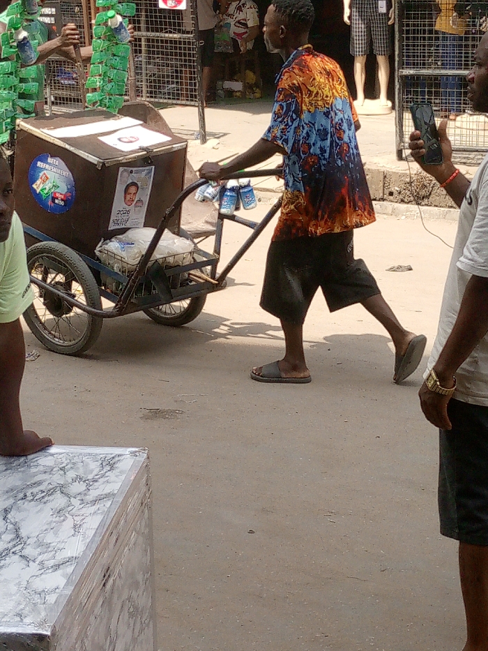 The scene depicts an urban street in Fegge, Nigeria, during daylight. A dark-skinned adult male, wearing a multi-colored short-sleeved shirt with a blue, orange, and black pattern, dark shorts, and dark slides, is prominently positioned in the center, pushing a two-wheeled utility cart. The cart features a dark, rectangular cooler box on its upper platform. A circular "BETA REFRESHMENT" sticker with snack images is affixed to the cooler box, along with a vertical poster displaying a male's face, "2026," and "SPIRITUAL MOVE" text. Several small, light blue plastic bottles are hanging from the cart's front bar. White plastic bags are visible in a lower basket on the cart. To the left in the foreground, a partial view of a dark-skinned individual in a light green t-shirt is visible, looking towards the viewer. To the right in the foreground, a dark-skinned individual, partially visible, wears a white t-shirt, dark shorts, and a gold-colored wristwatch on the left wrist. This individual holds a black smartphone vertically in their right hand. In the background, to the left, another person appears to be handling green objects resembling stacked plastic bottles behind a metal fence. Further into the background, indistinct figures and storefronts with mannequins dressed in clothing are visible, indicating commercial activity. The ground is a light-colored, unpaved or worn asphalt surface, and a slight curb or raised platform is present on the right side. A marble-patterned object, possibly a table or counter, is partially visible in the lower-left foreground.
