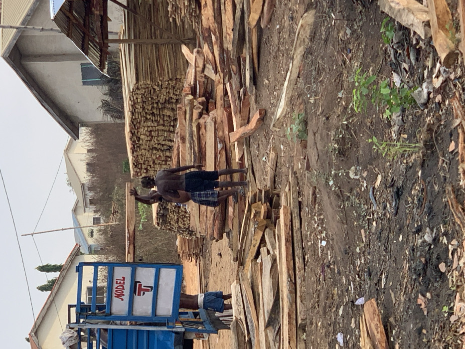 stack of timber planks in an outdoor setting. Two shirtless men stand among the planks, possibly working or inspecting the wood. A blue truck with "MODEL" written on its side is partially visible in the foreground, with a third man standing nearby. The ground is mostly dirt and littered with wood scraps. Buildings are visible in the background, suggesting the scene is in a residential or industrial area.