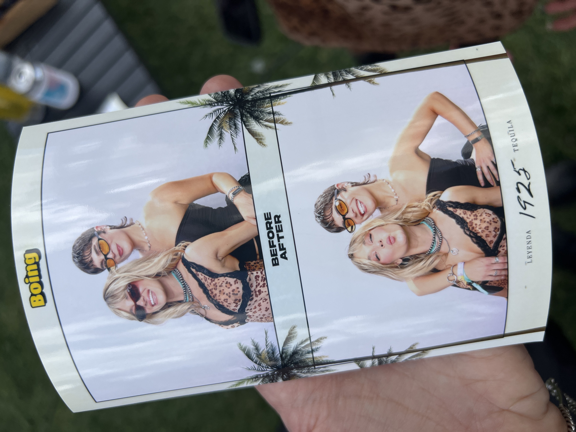 The photograph captures a person holding a promotional card for Boing Leyenda 1925 Tequila, featuring a "Before & After" image of two women. Both women are fair-skinned, with one having short, brown hair and wearing orange-tinted sunglasses, while the other has long blonde hair and dark sunglasses. In the "Before" image, both women are smiling. The "After" image seems to feature the same women, but they are striking a pose. A palm tree graphic is placed between the "Before" and "After" sides. The card itself has a white border, with the tequila brand and name printed along the right edge. The background of the photo appears to be an outdoor setting, possibly a lawn or park, with a glimpse of a table and other objects in the upper left corner. Given the branding and style, it's possible this image was taken at a promotional event or party, although this cannot be definitively stated. This photo does not contain enough information to determine the specific location in La Quinta.