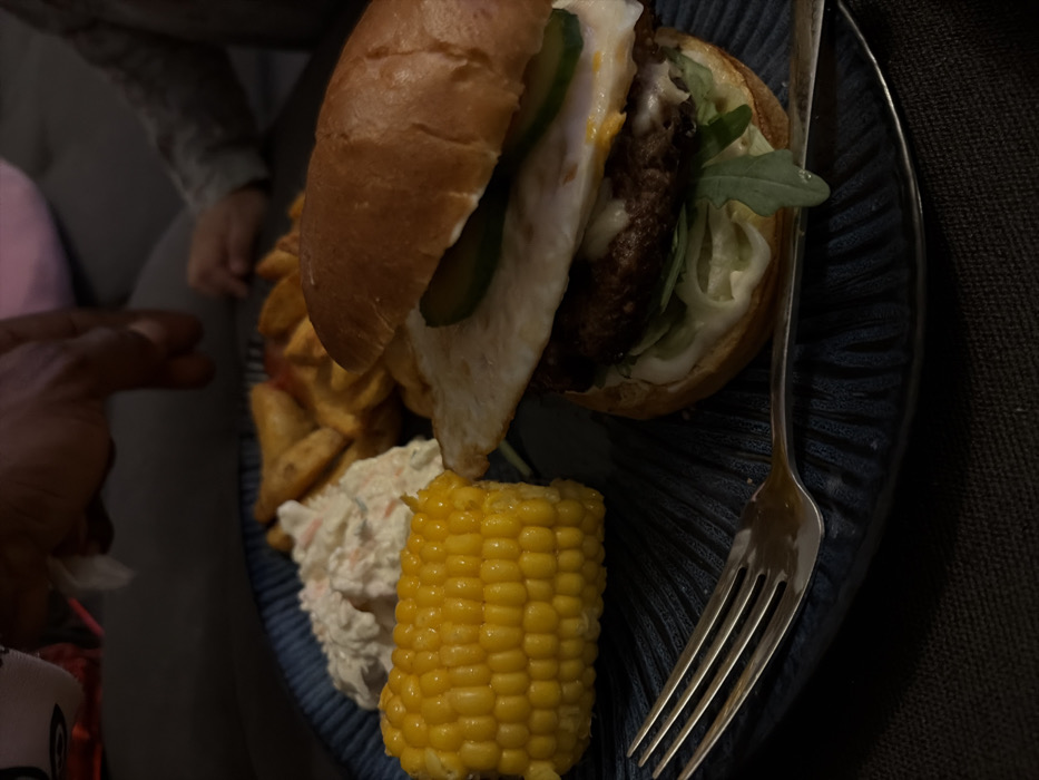 A plate features a burger with a fried egg, lettuce, and possibly cheese. Sides include seasoned potato wedges, coleslaw, and a segment of corn on the cob. A fork rests on the plate's dark blue textured surface. The scene is partially obscured, with portions of arms and clothing visible around the plate. The lighting suggests an indoor setting.