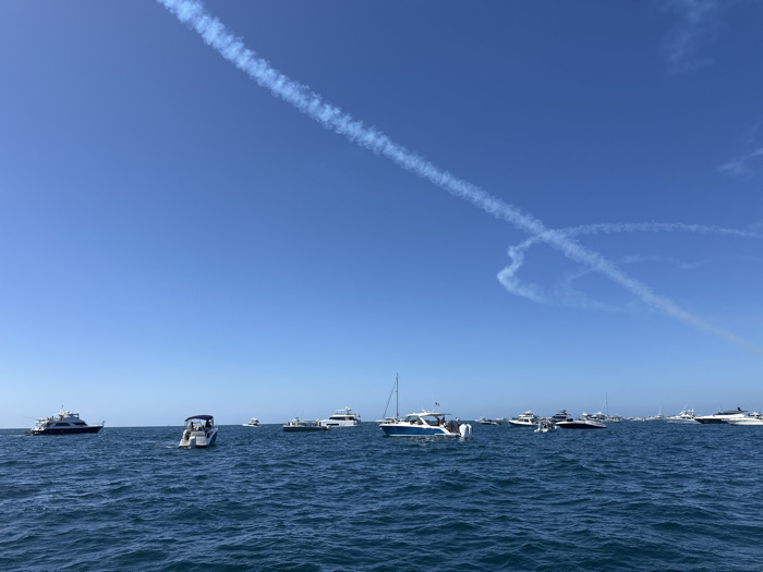 This image displays the coastal waters off Huntington Beach, United States, under a clear blue sky. White vapor trails from an aircraft are visible in the upper atmosphere, forming an "X" shape towards the right and a distinct diagonal line extending from the upper left. The ocean surface is a deep blue with moderate choppiness. Numerous recreational boats are distributed across the water, primarily consisting of motorboats and yachts. A white motorboat with a dark blue hull stripe and a small mast is positioned in the mid-left. Centrally, a smaller white motorboat with a dark canopy is visible, oriented with its stern facing the viewer, containing several occupants. Additional white and dark-hulled vessels of varying sizes are stationary or slowly drifting throughout the midground and background, indicating a gathering of marine traffic. No specific actions or interactions beyond passive observation are discernable among the people on the boats.
