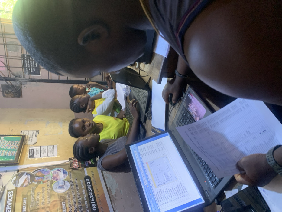 A group of people are seated at computers in what appears to be a cyber cafe. Some are typing while others look at the screens. The cafe offers various services like typesetting, printing, photocopying, scanning, and internet access. They also handle registration for recruitment and TME. A phone number, 08162458124, is listed for inquiries. The room is dimly lit.