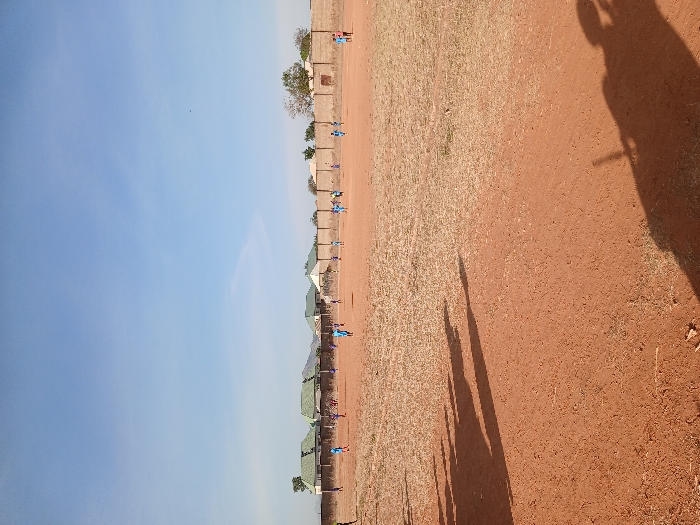The image displays an outdoor, unpaved sports field in Gwolong, Nigeria, under a clear blue sky
