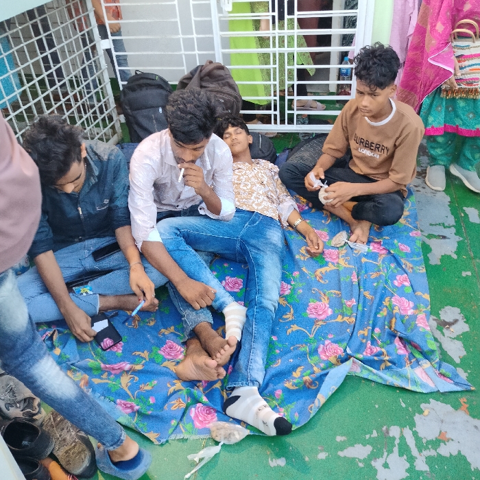 Four young men sit on a blue floral blanket outdoors. One man, wearing a white shirt, smokes while another in a brown "BURBERRY LONDON" shirt, prepares something in his hands. The third man, wearing a patterned shirt, lies down. The fourth man, in a dark blue shirt, holds a pen and looks down. Backpacks sit behind them near a white railing. The floor is a green surface, with debris scattered around. One person at the edge of the photo is only partially visible.