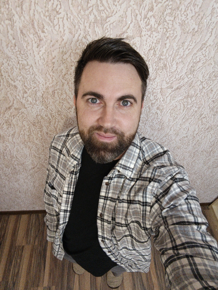 A man with fair skin, dark hair, and a beard stands indoors. He wears a black t-shirt under an unbuttoned plaid flannel shirt. He looks directly at the camera. The background consists of a textured, light-colored wall and a wooden floor. The camera angle is high, creating a selfie-like perspective.