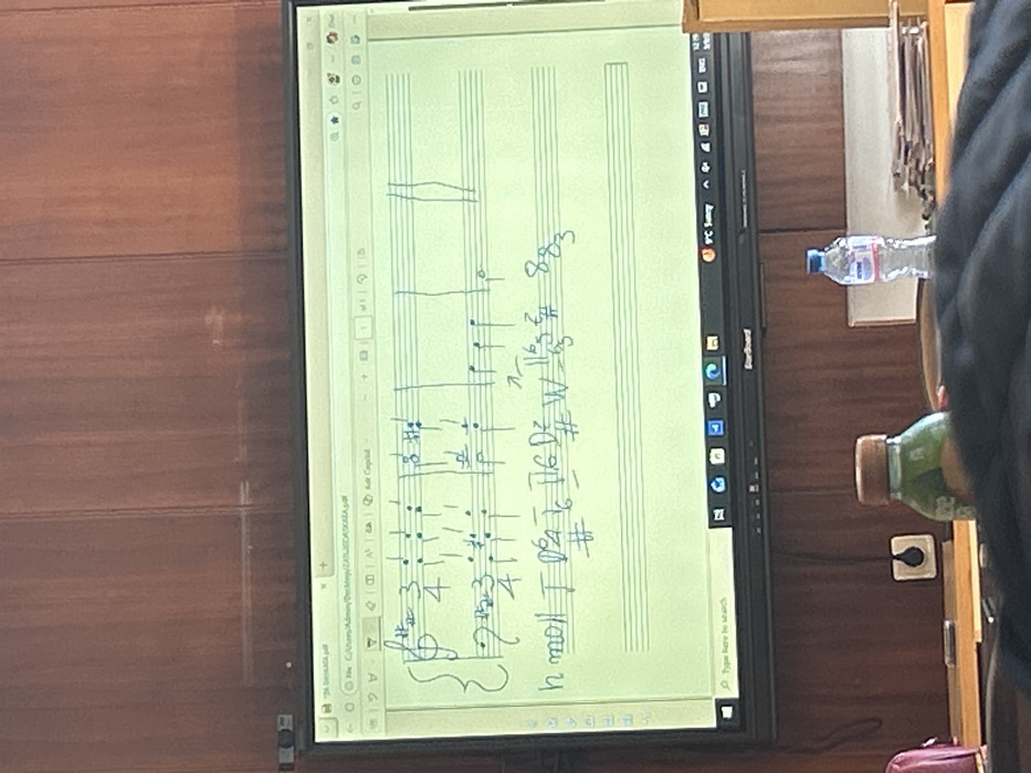 The image depicts an indoor scene in Kotel, Bulgaria, focused on a large display screen and a wooden desk. The screen, framed in black, displays musical notation with handwritten annotations. The digital sheet music includes both treble and bass clefs, a 3/4 time signature, various notes, and accidentals, along with harmonic analysis symbols such as "h moll I D#4/6 II6 D# W II6/5 8#3". The screen's taskbar indicates a file path `C:\Users\Admin\Desktop\ZATLEDASONATA.pdf`, the current time as 12:05, date as 12/03/2024, and weather as "9°C Sunny". A small, black webcam or sensor is mounted on the top center edge of the display. On the wooden desk surface in the foreground, from left to right, are a green bottle with a brown cap and a clear plastic bottle of DEVIN mineral water with a blue cap. To the right of the water bottle, a stack of papers or documents is visible. A white, single-socket power outlet is mounted on the wooden-paneled wall directly behind the desk. The lower portion of the frame is occupied by a dark, blurred object, possibly a person's lap or an article of clothing. The background wall is constructed of vertical wooden panels.
