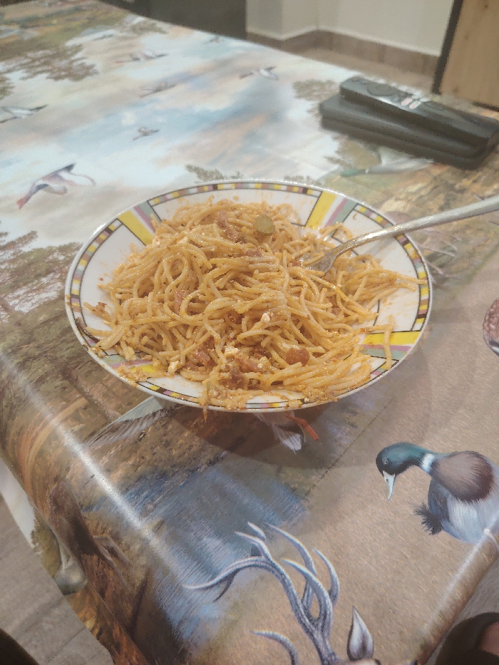 The image displays an indoor scene, likely a dining area, located in what is stated as the city of Izvor, Bulgaria. The primary subject is a white ceramic plate, featuring a yellow, pink, and black striped border, filled with spaghetti pasta. The spaghetti is coated in a reddish-orange sauce and contains visible white crumbled cheese, small green olives, and fragments of reddish-brown meat. A silver-colored metal fork rests within the spaghetti, angled towards the right side of the plate. The plate is positioned on a table covered with a glossy, patterned tablecloth. The tablecloth design depicts a rustic outdoor landscape with various wildlife, including a detailed image of a mallard duck's head and neck in the lower right, and a section of deer antlers in the lower center. Other elements of the pattern include birds in flight and forested scenery. In the upper right background, a dark-colored remote control with visible buttons rests on the tablecloth. The background shows a light-colored wall with a darker baseboard, indicating a corner of a room. No people are visible, and no explicit actions or interactions are depicted beyond the presented meal. The lighting suggests an artificial indoor light source.