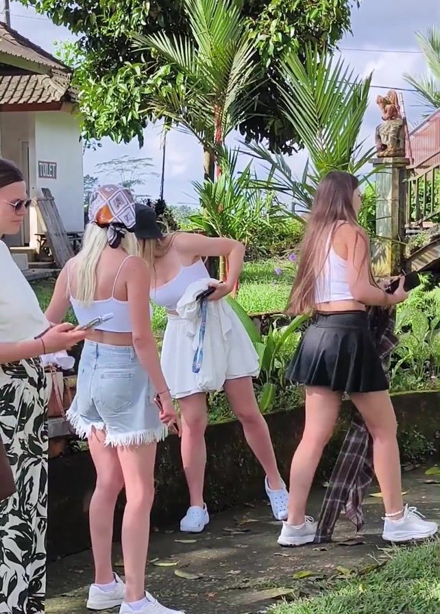 four young women standing or walking outside in a tropical environment. One woman wears a white cropped top and long black and white patterned pants. Another wears a white cropped top and jean shorts. A third wears a white cropped top and white skirt. The last woman wears a white cropped top and a black mini skirt. They are standing near a low concrete wall with tropical plants and trees behind it. One of the women is adjusting her white skirt. There is a small building with the word "TOILET" visible on the side. A statue is visible behind the women in the background.