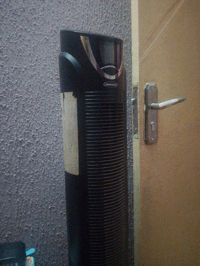A black tower fan stands against a textured gray wall, partially obscuring a closed, light brown door. A silver door handle and latch are visible on the door. A rectangular beige sticker is peeling off the side of the fan. Part of a dark object rests near the bottom of the wall and fan. The lighting in the image is dim.