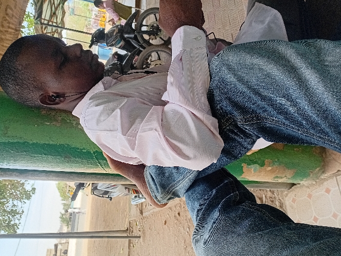 A dark-skinned male, likely an adult, is seated outdoors in Dorayi, Nigeria, leaning against a weathered green pillar with peeling paint