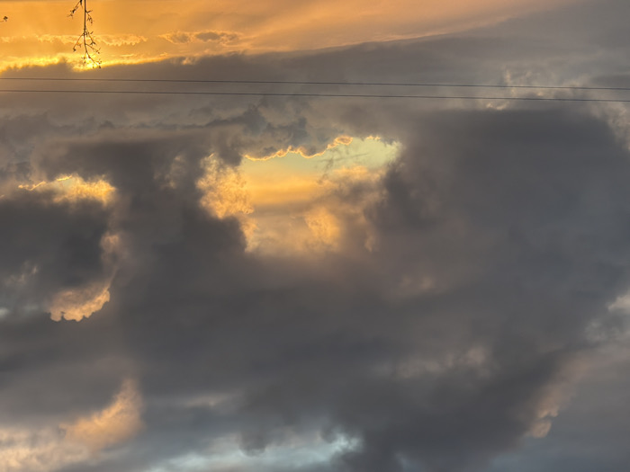 Golden light peeks through the turbulent, gray clouds filling the sky. A small opening reveals a glimpse of the setting sun. Thin branches hang in the upper left corner, silhouetted against the bright light. Two electrical wires stretch horizontally across the image. The clouds are dense and layered, creating a dramatic and atmospheric scene.