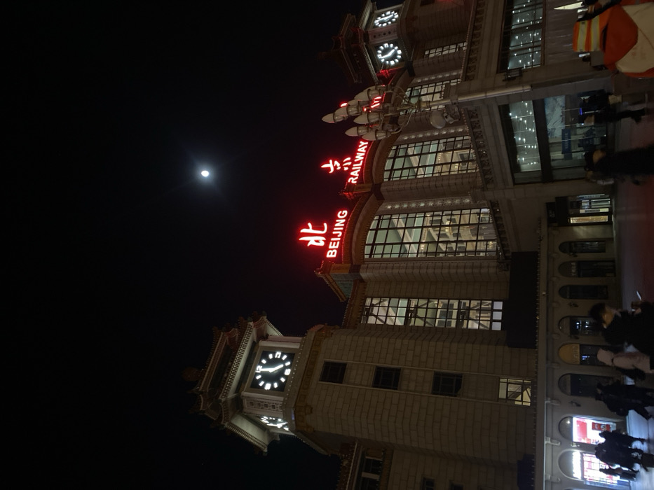 Beijing Railway Station is brightly lit at night. The station's clock tower displays the time, and its name, "Beijing Railway," is emblazoned in red neon. The moon shines faintly in the night sky above the station. Pedestrians walk along the sidewalk near the building.
