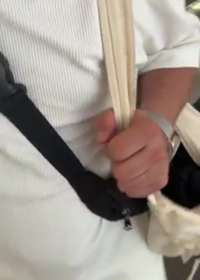 The video begins with a close-up of a person wearing a white top. The person is holding the straps of a beige tote bag in one hand and a black crossbody bag is visible. The camera moves to show the person as they ride up an escalator inside a modern airport with a high, arched ceiling. The person makes a thumbs-down gesture toward the camera.