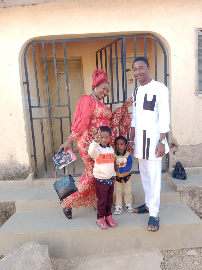 A family of four stands in front of a building with a barred archway. A woman in a red dress and matching head wrap holds a black purse. A man in a white shirt and pants with black accents stands to her right. Two young boys stand in front of them, one in a white shirt with writing and the other in a blue and yellow sweater. They are standing on concrete steps leading up to the building.