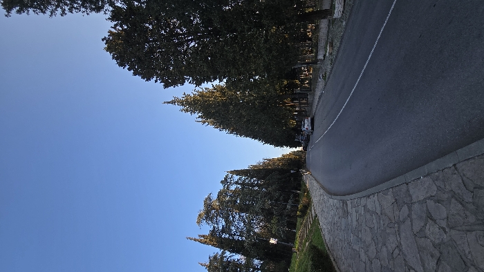 This image depicts a tree-lined street in Stara Zagora, Bulgaria, under a clear, bright blue sky. The scene is illuminated by natural light, suggesting either late afternoon or early morning. A dark grey asphalt road occupies the center and right portions of the lower half of the frame, extending into the distance and curving subtly to the left. A continuous white line marks the right edge of the paved road. Along the right side of the road, several vehicles are parked parallel to the curb, facing away from the viewer. A light-colored sedan is visible among them. A row of tall, slender evergreen trees with dense foliage forms a continuous line along the right side of the street, bordering a slightly elevated area behind the parked cars. To the left of the road, a wide pedestrian pathway constructed from irregularly shaped grey flagstones curves upwards and away from the viewer. Adjacent to this path is a grassy slope, interspersed with low green shrubs and dotted with various trees, including tall, conical evergreens and broader deciduous trees. A dark-colored lamppost is visible on this slope, positioned near the path. Visible steps are integrated into the grassy incline on the far left. No individuals are present in the scene.