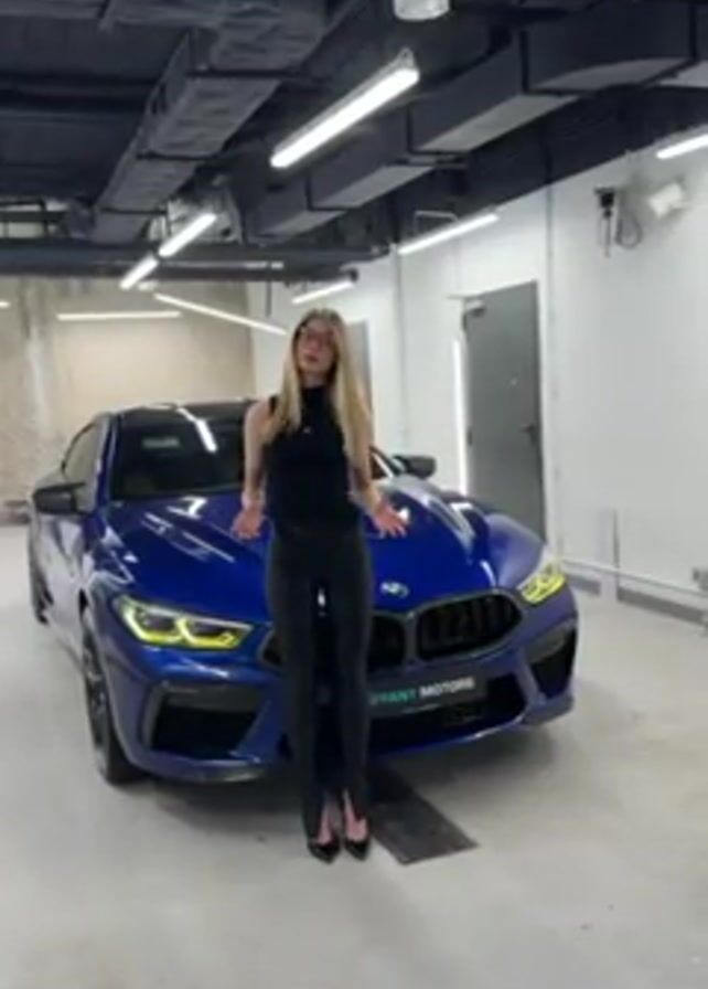 A woman wearing black pants and a black top stands in front of a blue BMW sedan in an indoor parking area