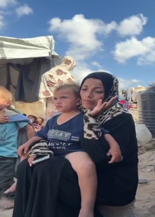 The video depicts a woman wearing a black hijab with a leopard print pattern holding a young child with curly blonde hair in her lap. The child is wearing a navy blue shirt. In the background, another woman wearing a floral hijab stands near a makeshift tent structure. Other children are visible in the scene, including one wearing a blue shirt with the word "RED" printed on it. The environment appears to be a camp or settlement, with water tanks and laundry lines visible. The sky is blue with scattered clouds. The woman holding the child seems to be looking off into the distance. The child also has an attentive expression.