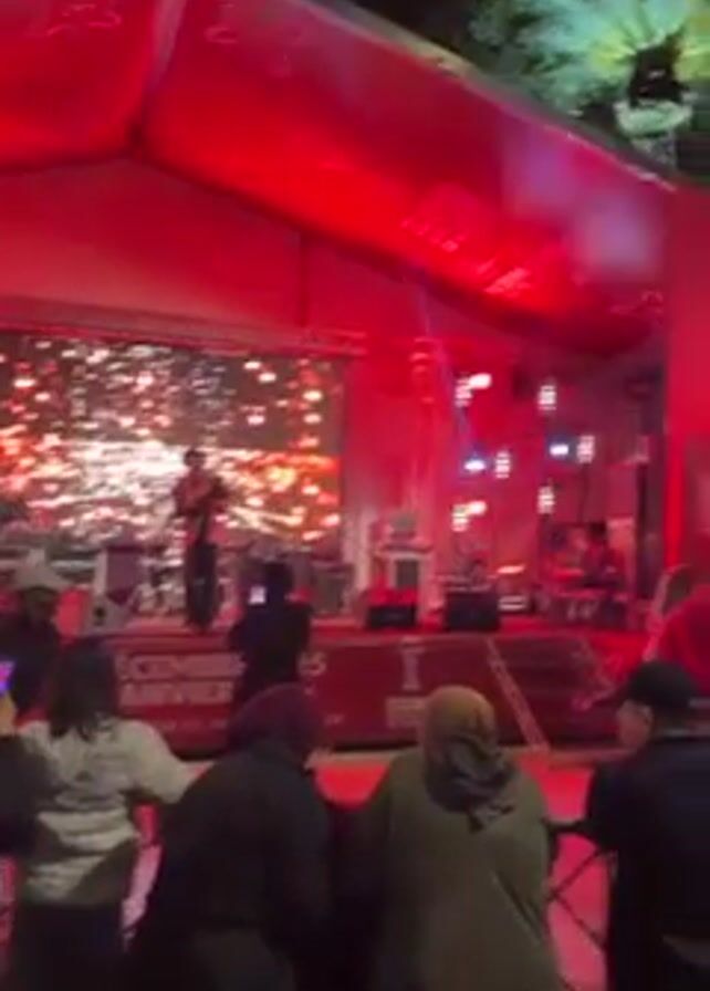 A man in a black suit is performing on a stage under a large red tent roof. A large screen behind him displays an abstract pattern of lights. A framed portrait and a flag stand to his left. Several people are standing in the foreground, watching and recording the performance on their phones. There are palm trees in the background and stage lights illuminating the performance area. Text on the tent roof and stage appears to advertise a December-January event.