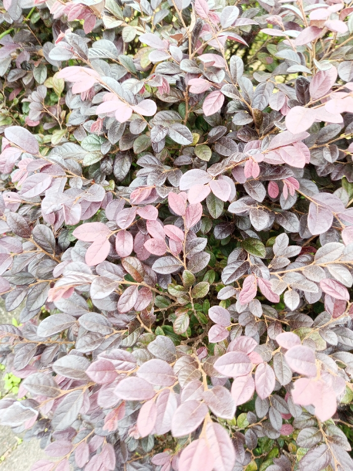 A dense shrub displays a mix of foliage hues. Leaves range from light pink to deep burgundy and greenish-gray, creating a multicolored effect. The leaves are small and densely packed on thin, brown stems. The overall texture is soft and rounded, with an organic and natural feel. Green stems and occasional glimpses of the ground contribute to the dense, layered appearance of the plant.