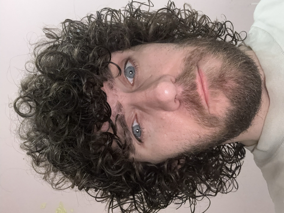A close-up portrait taken in Pushkino, Russia, features an adult male subject looking directly into the camera. The male has fair skin, prominent blue eyes, and dense, dark brown curly hair. A dark brown beard and mustache are present. His facial expression is neutral, with a closed mouth and a direct gaze. He wears a light-colored, possibly beige or light green, crew-neck garment, visible at the bottom of the frame. The background consists of a plain, light pink wall, exhibiting slight discoloration or texture in the upper left area.