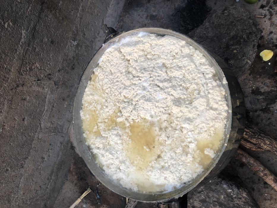 An overhead view captures a large, circular metal pot containing a creamy-white, granular substance immersed in a translucent, yellowish liquid, exhibiting areas of frothing on its surface. The pot, approximately 60-70 cm in diameter, rests on a dark, uneven ground surface, supported by what appears to be a rudimentary stove structure. Several pieces of dark brown firewood are visible beneath the pot. In the lower right corner, two small, pale green objects, consistent with citrus peels, lie on the ground. A textured, dark grey wall or structure forms the background. The scene is set outdoors in Rido, Nigeria. No individuals are visible.