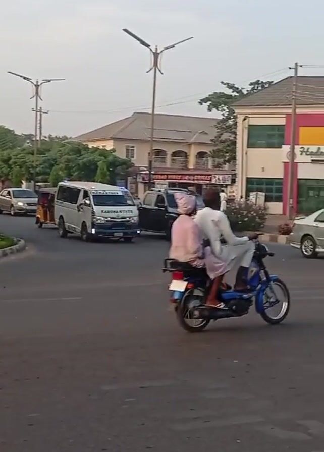 street in an urban area. The road is paved and lined with sidewalks. There are traffic lights at an intersection, and a variety of vehicles are visible, including cars, vans, motorcycles, and auto-rickshaws. One motorcycle, carrying two passengers, drives through the intersection. There are buildings on either side of the street, including a building with the sign "Gusau House" visible. The sky is overcast and the light is even. There are trees and vegetation throughout the area. A man pushes a cart along the sidewalk.