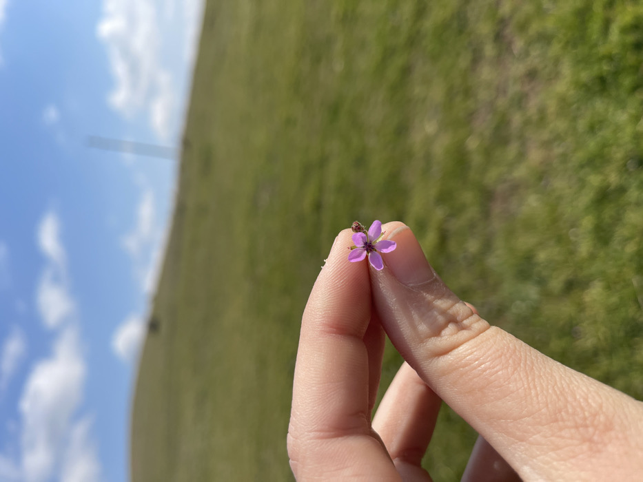 - "The image presents a close-up view of a human left hand holding a single small, five-petaled purple flower, centrally positioned against a blurred outdoor landscape" by FM-8MhsB2, licensed under CC BY 4.0